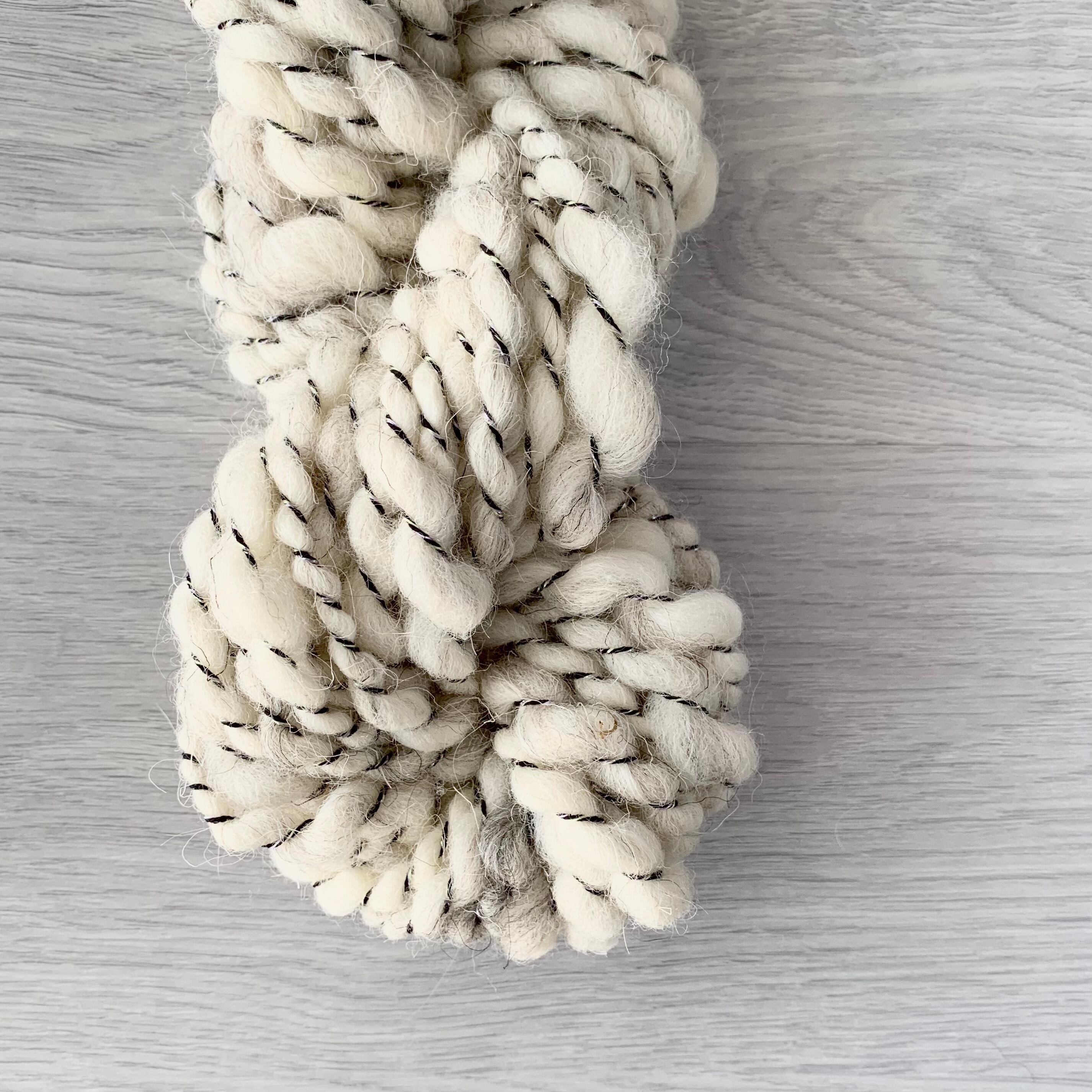 ナチュラルな質感の違う様々な白い羊毛をMIXしたものと、シルバーのラメの入った黒い細い糸を撚り合わせた双糸の紡ぎ糸です。通常より耐久性が少し高めです。